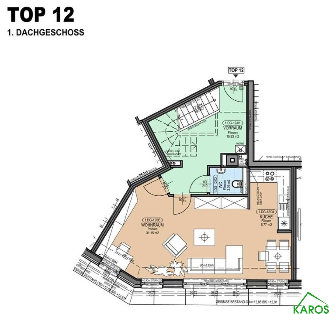 im 1. DG: einen Vorraum, ein WC, einen Abstellraum, eine Küche, einen großzügigen Wohnraum mit 31,15 m² = 54,88 m²