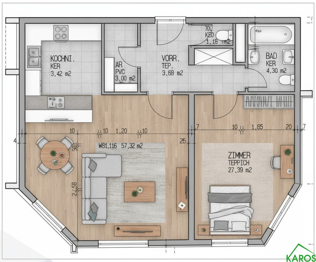 Die Wohnung verfügt über ein zentral begehbares Raumkonzept: ein einladendes Vorzimmer, einen praktischen Abstellraum, ein Badezimmer mit Badewanne und separatem WC, eine helle Wohnküche mit moderner Einbauküche sowie ein ruhiges Schlafzimmer.