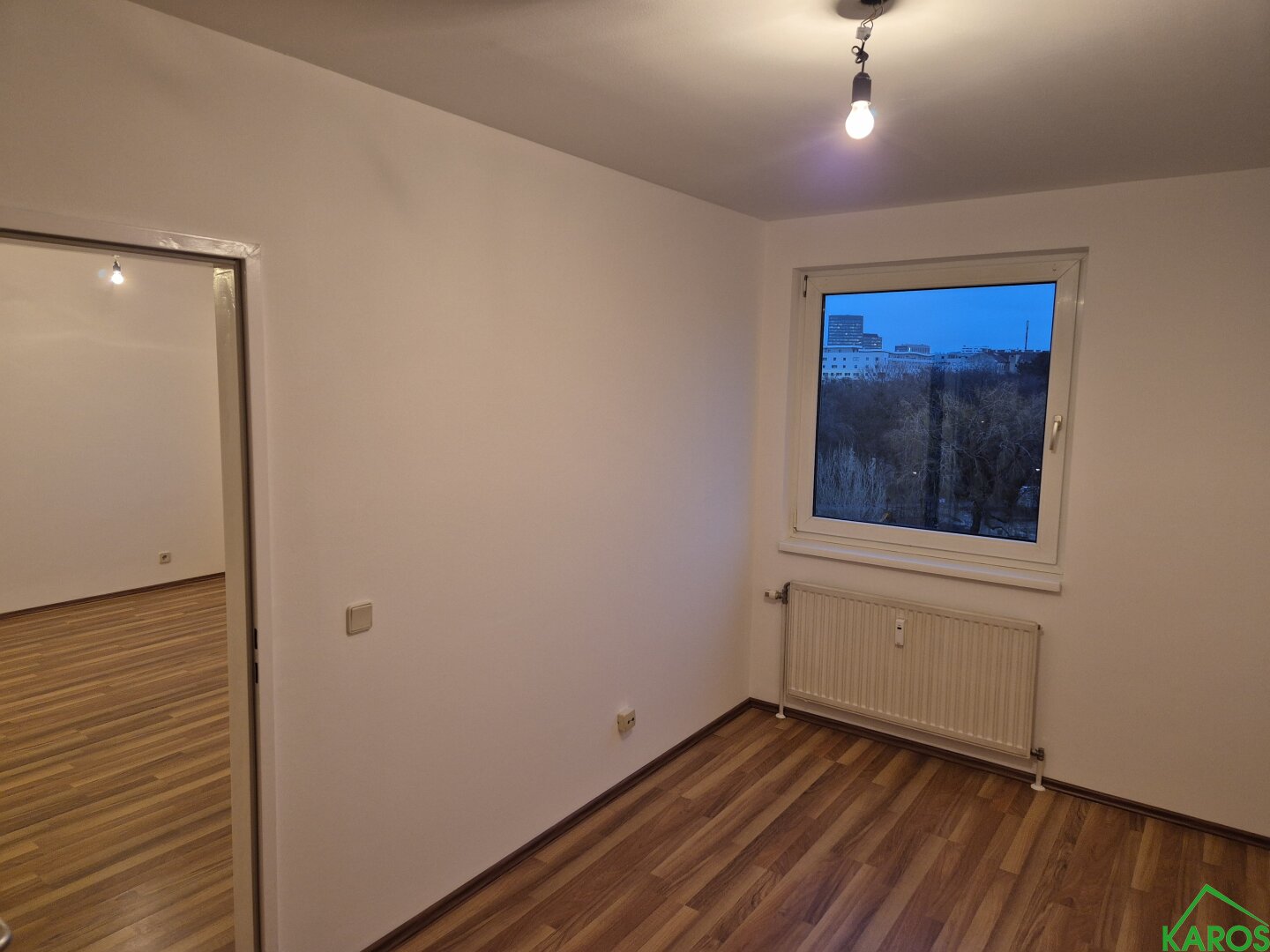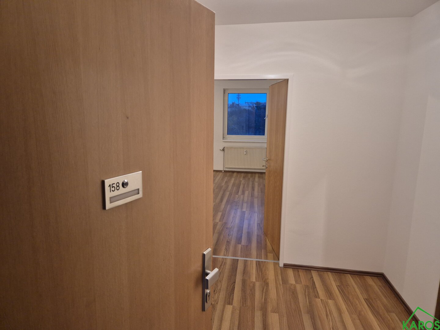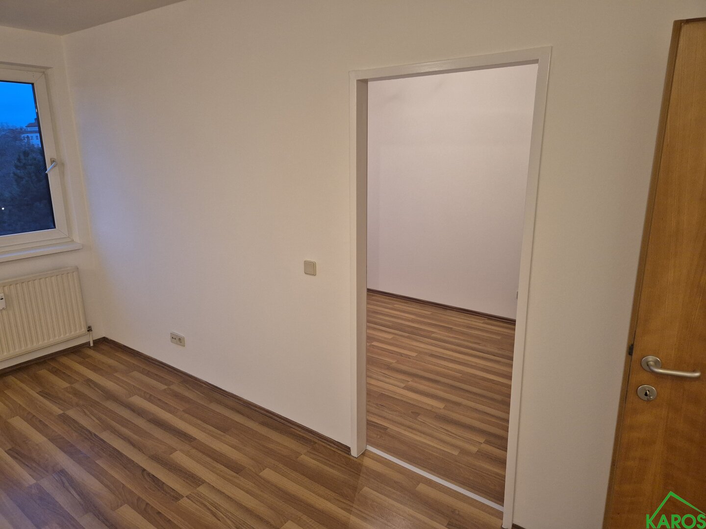 Die Räume sind weiß gemalt und wirken hell und freundlich. Sowohl Vorraum, als auch Kochnische und Bad sind mit neutralen Fliesen, die Wohnräume mit Laminatböden ausgestattet. Ein Abstellraum bietet genügend Stauraum.