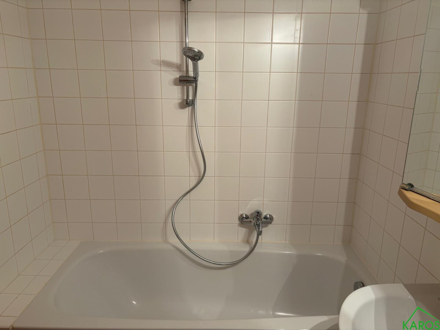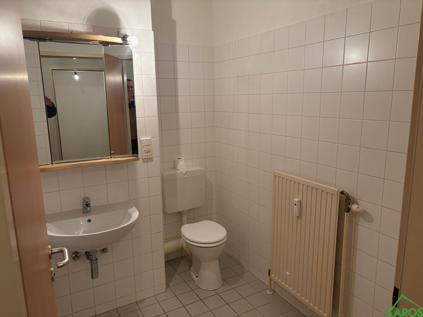 Sowohl Vorraum, als auch Kochnische und Bad sind mit neutralen Fliesen ausgestattet.