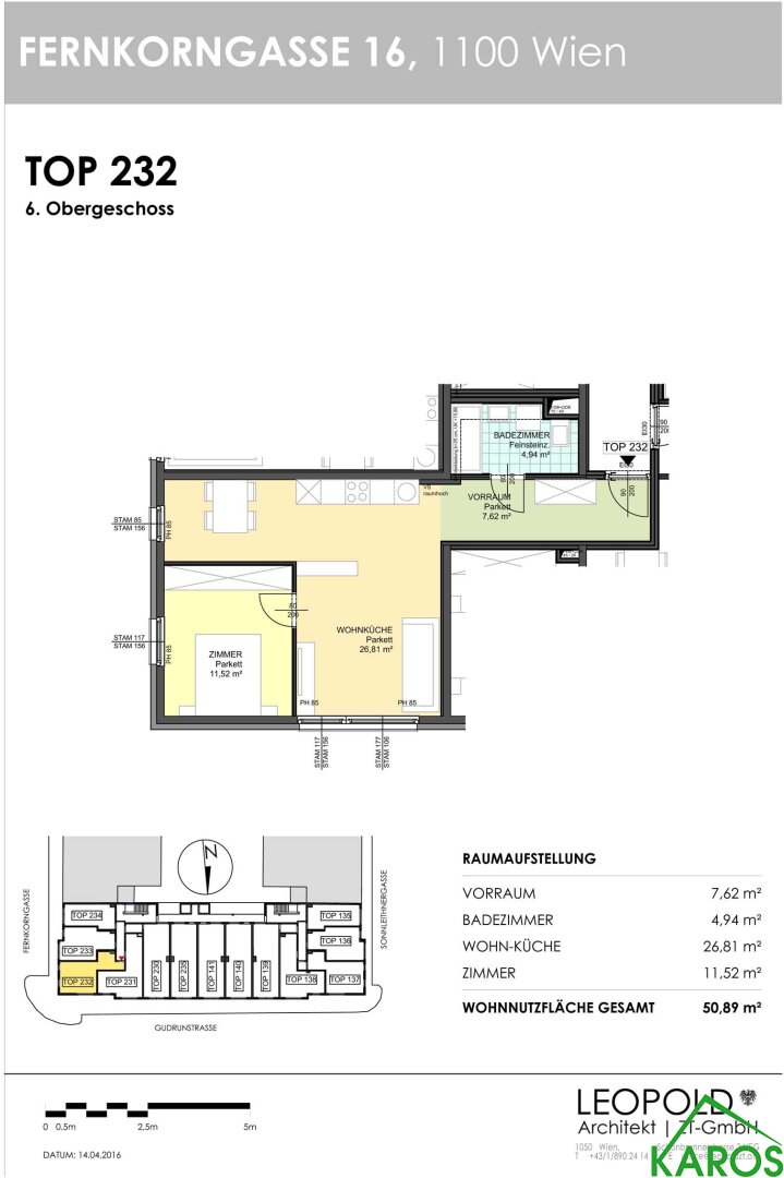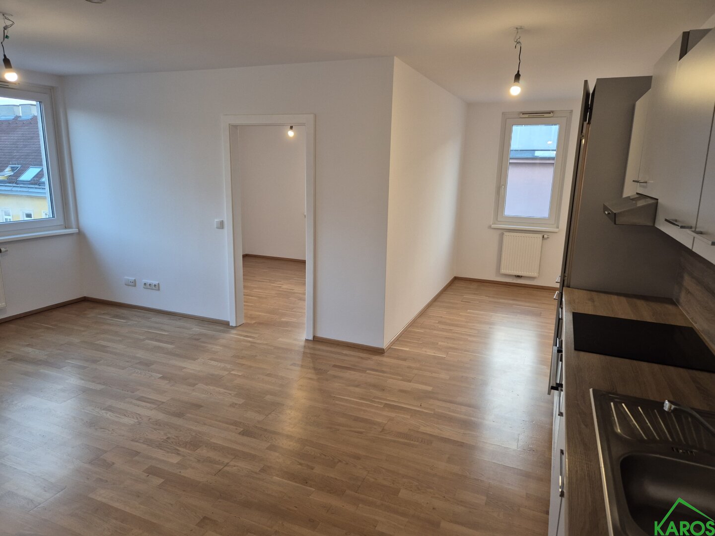 Zur unbefristeten Anmietung gelangt die 50,89 m² große Neubauwohnung, zentral begehbar, bestehend aus Vorraum, Bad mit Wanne, Wohnküche und Schlafzimmer. Die Räume sind strahlend weiß gemalt und mit hochwertigen Parkettböden bzw. Feinsteinzeug ausgestattet.